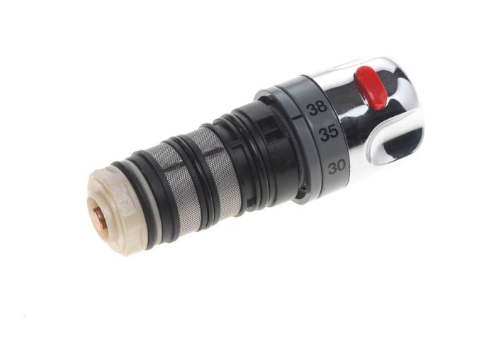Replacement thermostatic cartridge including temperature control knob with red override button, suitable for Midas 100 shower models.